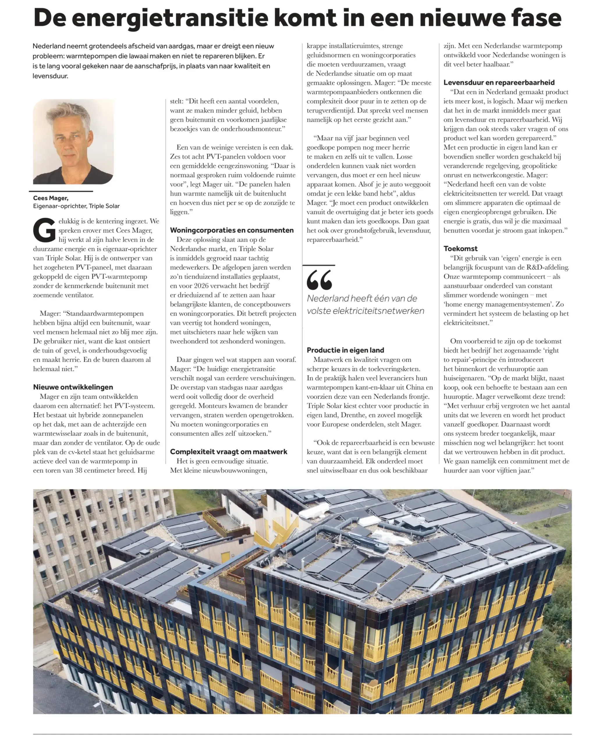 Ontdek hoe Triple Solar de energietransitie vernieuwt met stille PVT-warmtepompen zonder buitenunit. Oprichter Cees Mager vertelt over de focus op kwaliteit, lokale productie in Drenthe en het belang van repareerbaarheid voor een duurzame toekomst.